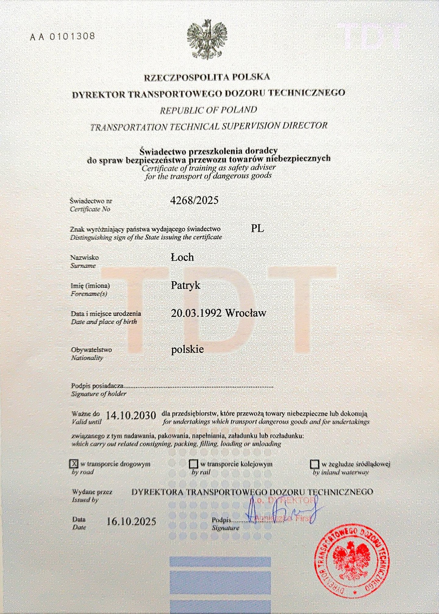 Certyfikowany Doradca ds. bezpieczeństwa przewozu towarów niebezpiecznych